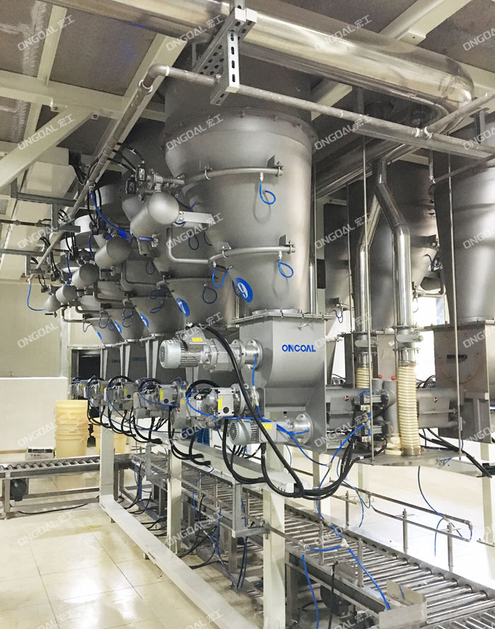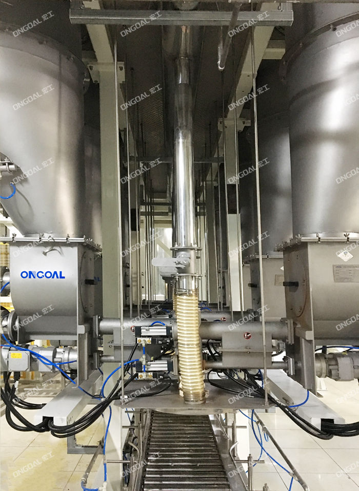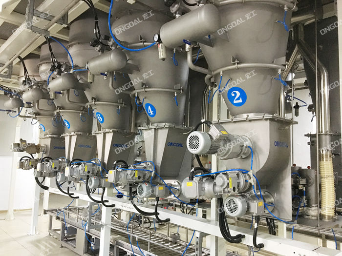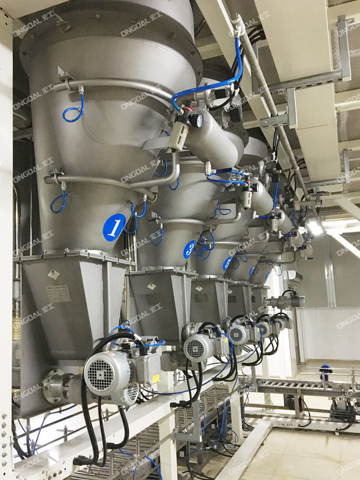 配料系統(tǒng)的工作流程是:人工將物料利用提升機提升至平臺;人工將物料分別放到對應(yīng)的料倉;設(shè)定配方--人工將周轉(zhuǎn)桶放到輸送線入口一周轉(zhuǎn)桶定位--喂料機將物料送入周轉(zhuǎn)桶;計量稱精確稱重一由輸送機自動輸送到下一單元重復(fù)配料-周轉(zhuǎn)桶自動輸送到出口,人工收集放標(biāo)識卡。