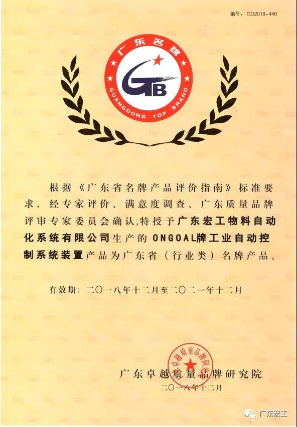 2018年12月19日,廣東名牌網發(fā)出《關于公布2018年廣東省行業(yè)類名牌產品名單的公布》。廣東宏工物料自動化系統(tǒng)有限公司,憑借其雄厚的實力、較高的客戶滿意度和良好的品牌信譽,順利斬獲“2018年廣東省名牌產品”稱號。